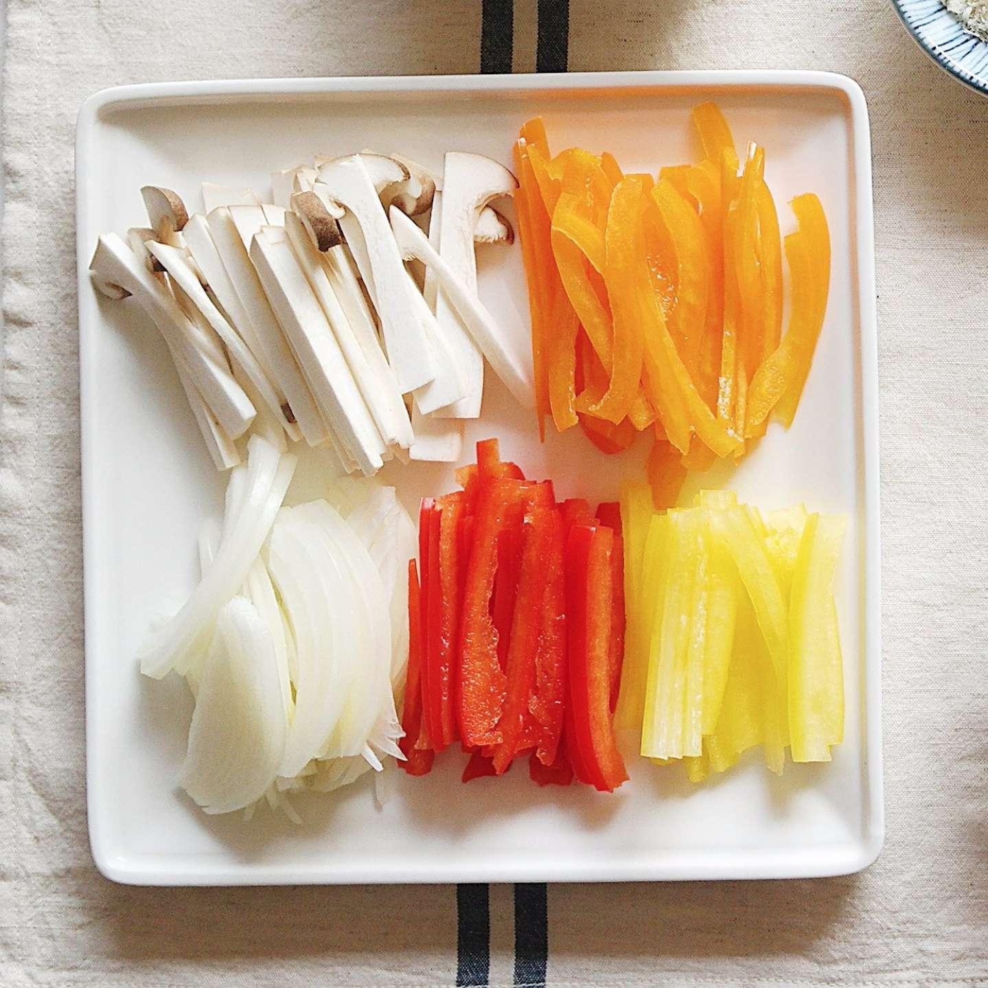 Nấm đùi gà, ớt chuông thái thành các thanh dài. Hành tây thái lát mỏng.