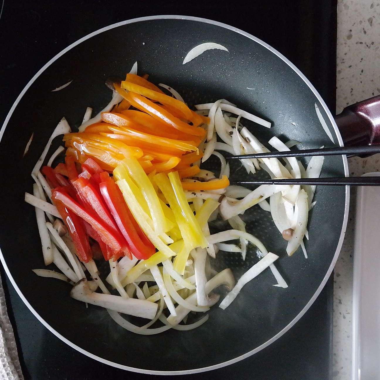 Làm nóng chảo, cho một ít dầu thực vật vào. Khi dầu nóng cho hành tây vào trước, đảo vài nhát thì cho tiếp nấm, ớt chuông vào. Tiếp tục đảo nhanh tay với lửa lớn đến khi hành tây chuyển hơi trong thì thêm một ít hạt tiêu rồi tắt bếp.