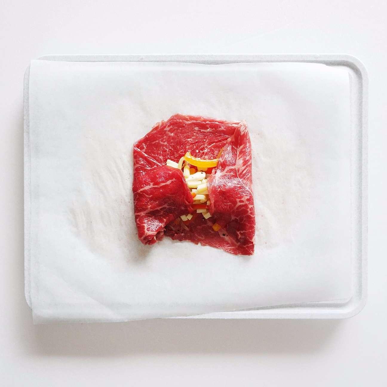 Rải một ít muối và hạt tiêu lên bề măt thịt, cho phần nhân vừa xào ở trên vào cùng với phô mai mozzarella. Gấp hai bên mép rồi cuộn tròn lại như khi cuộn nem rán.