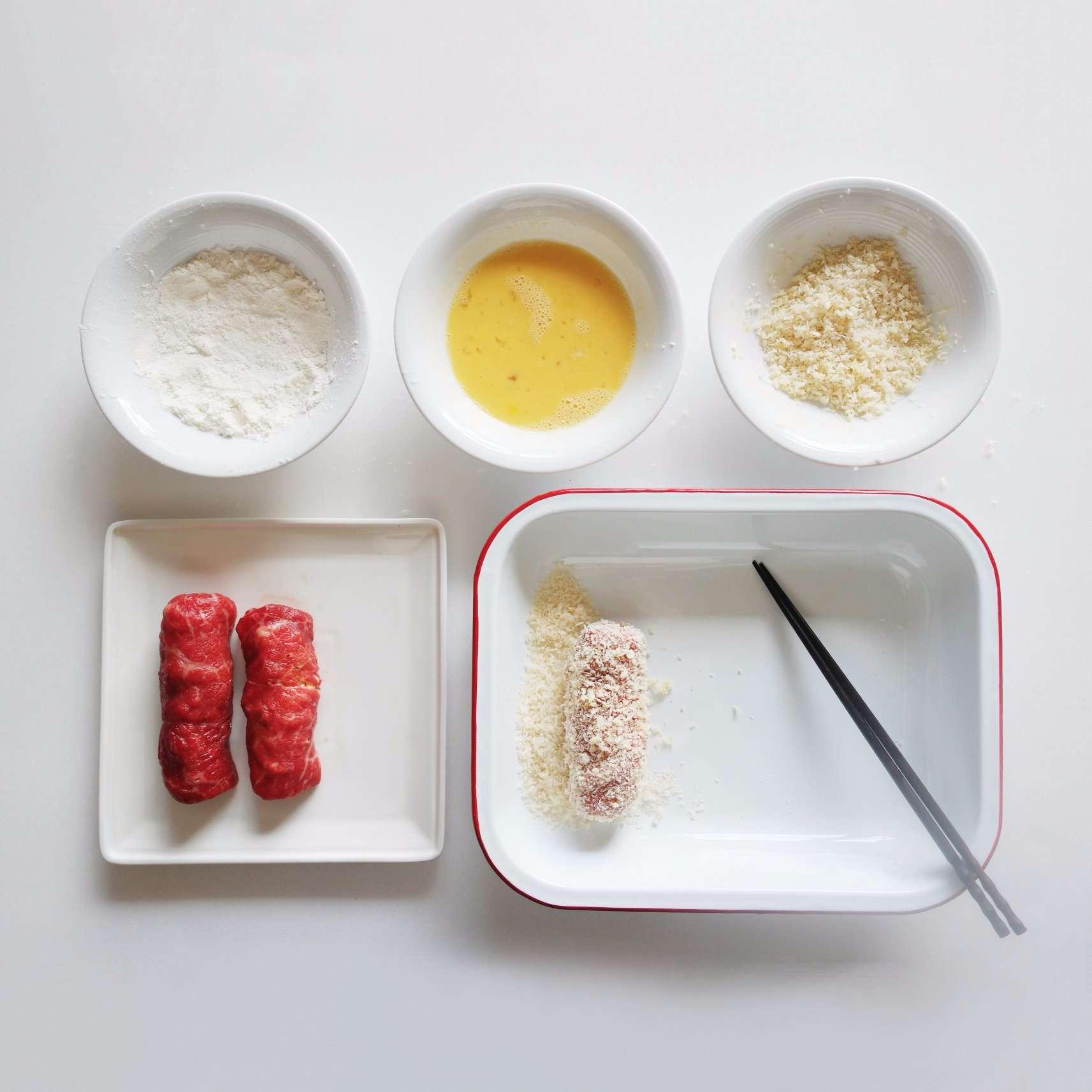 Lăn cuộn thịt bò qua bột mì, trứng rồi bột chiên xù. Nếu thích ăn lớp vỏ ngoài dày hơn, bạn có thể lăn thêm một lượt trứng và bột chiên xù nữa.