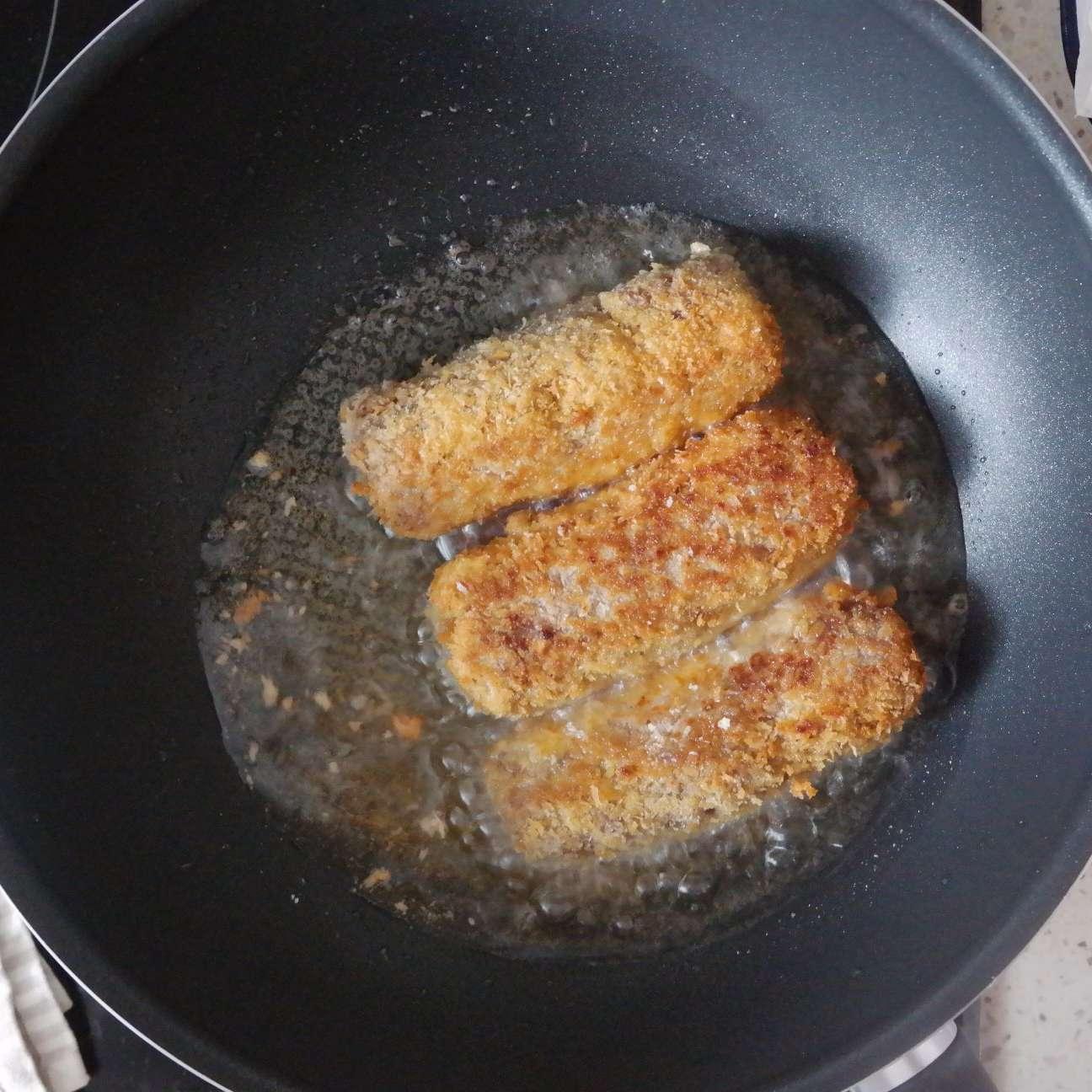Làm nóng chảo dầu rồi cho cuộn thịt bò vào để chiên cho đến khi vàng giòn rồi vớt ra để ráo dầu.