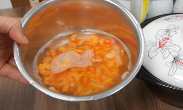 - Tôm khô ngâm vào nước ấm khoảng 30 phút cho mềm rồi rửa sạch, băm nhuyễn.