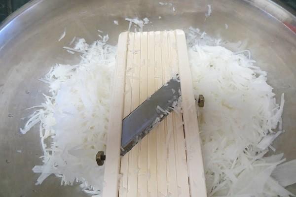 - Củ cải rửa sạch, gọt vỏ, bào nhỏ rồi cho qua rá lọc, vắt lấy nước cốt.