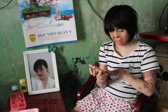 Từ cô gái có làn da mịn màng, trắng trẻo... giờ đây gương mặt Dung là những mảng sẹo lồi lõm, nhiều vùng da bật máu. Mái tóc dài mượt mà ngày xưa giờ lởm chởm, khô cứng, được túm gọn dây chun đằng sau để Dung tiện sinh hoạt.