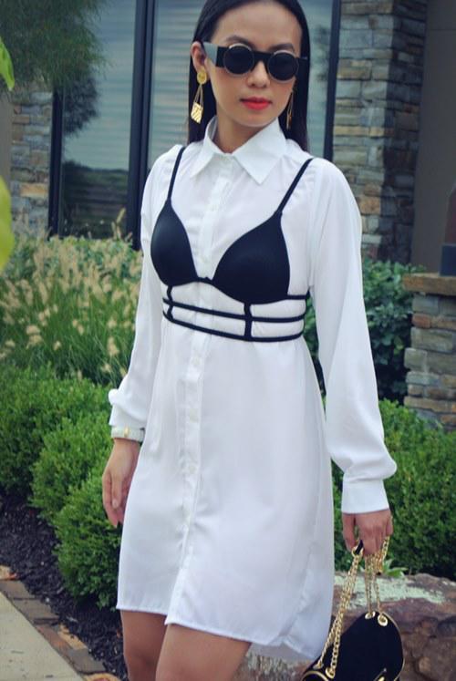 Sĩ Thanh nhập cuộc nhưng kín đáo và không kém phần táo bạo khi mặc nội y ra ngoài áo sơ mi trắng, tạo nên 2 sắc màu đối lập.