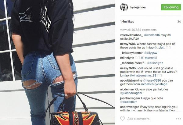 Người đi đầu xu hướng với mốt quần quần rách bàn tọa chính là Kylie Jenner. Khá tự tin, cô gái nổi tiếng này đã đăng tải hình ảnh mình với quần rách mông lên trang cá nhân.