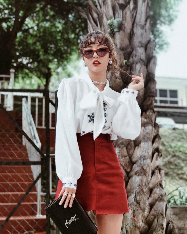 Quỳnh Anh Shyn cập nhật xu hướng rất nhanh khi mix áo tay bồng cùng chân váy midi.