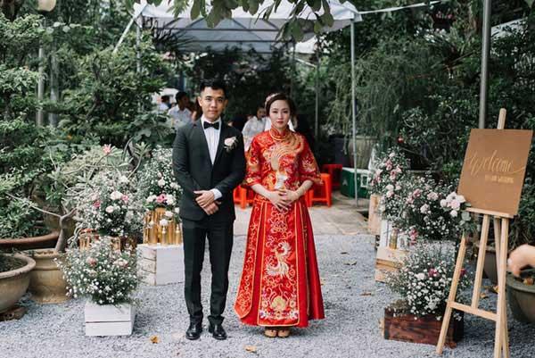 Ngày trọng đại, Ngân và Luyện xúng xính trong bộ trang phục truyền thống trong đám cưới người Hoa, cùng nhau trải qua thời khắc thiêng liêng nhất của đời người. Phía trước cổng chào, Ngân khéo léo bày những chậu hoa nhỏ đúng màu cô yêu thích, giản dị và rất đỗi dịu dàng, đáng yêu.