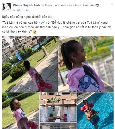 Trước nghi án tổ ấm bị lung lay, Phạm Quỳnh Anh chủ động đăng đàn trấn an tinh thần của khán giả hâm mộ. "Tag" tên ông xã Quang Huy vào bức ảnh chụp chung với con gái Tuệ Lâm, giọng ca họ Phạm ngầm khẳng định hôn nhân của mình vẫn yên ấm.