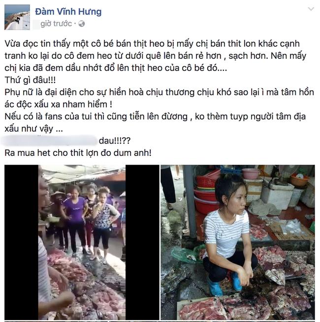 Không chỉ lên án sự việc bằng bàn phím, giọng ca Biển tình quyết định dùng hành động thiết thực giúp đỡ người bị hại. Theo đó, Mr Đàm mở lời nhờ người thân ra chợ mua hết số thịt lợn bị tạt dầu luyn. "Ra mua hết số thịt đó cho anh", Đàm Vĩnh Hưng nhắn nhủ.