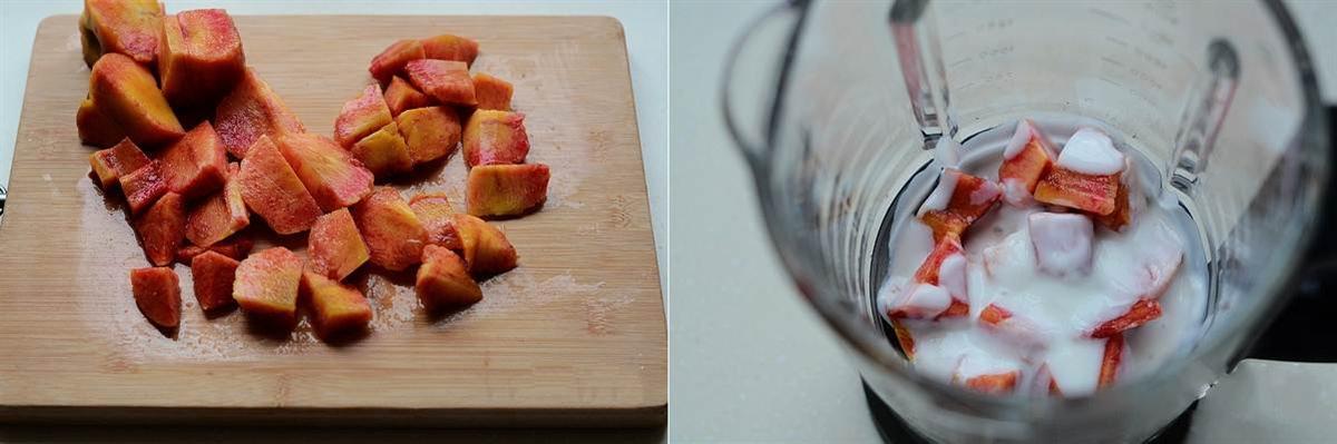 Bước 1: Đào gọt vỏ bỏ hạt thái miếng nhỏ. Cho đào, kem tươi, sữa chua vào máy xay sinh tố.