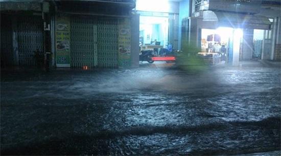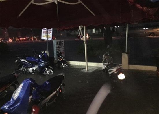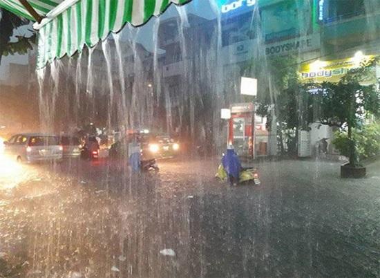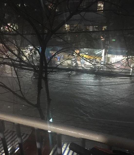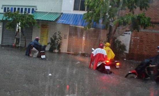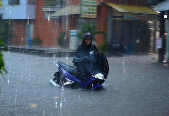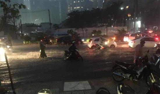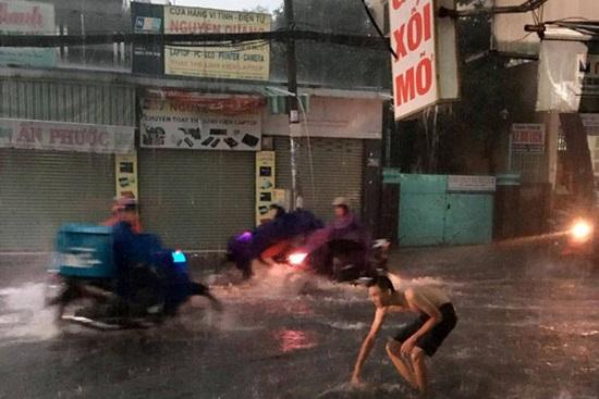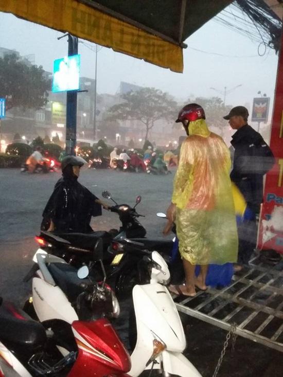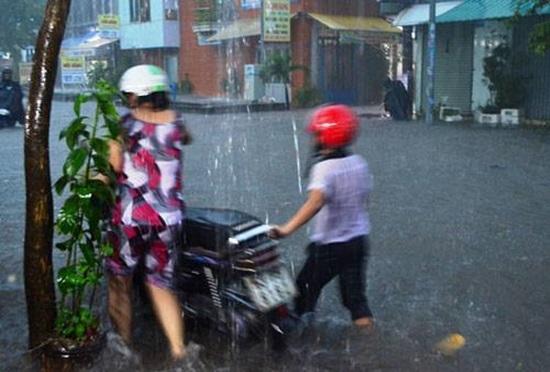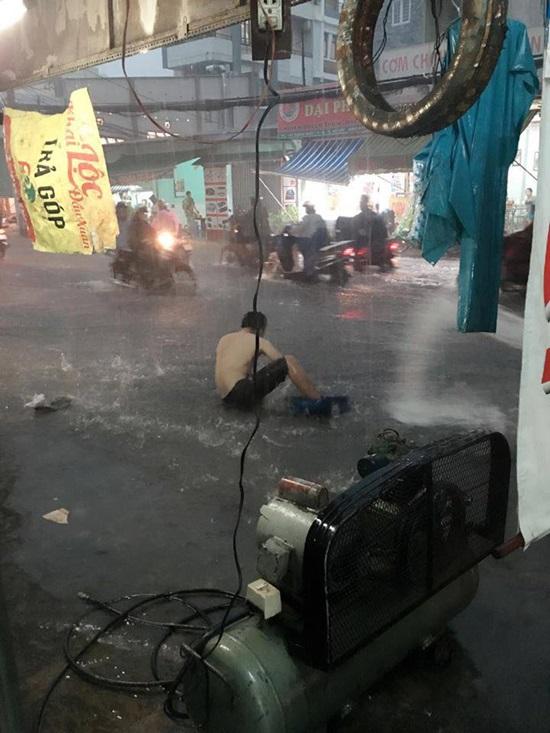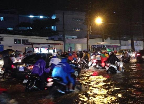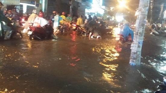 16h, mưa lớn đổ xuống quận 12, quận Gò Vấp, Tân Bình, Tân Phú... Khoảng 30 phút sau, các tuyến đường ngập nước hơn nửa mét. Xe cộ chết máy hàng loạt phải dẫn bộ bì bõm.