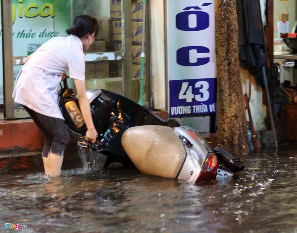 Một số điểm đen như phố Vũ Trọng Phụng, Vương Thừa Vũ... nước ngập lút bánh xe. Hàng loạt xe chết máy khiến người dân phải dắt bộ. Ảnh: Việt Linh.