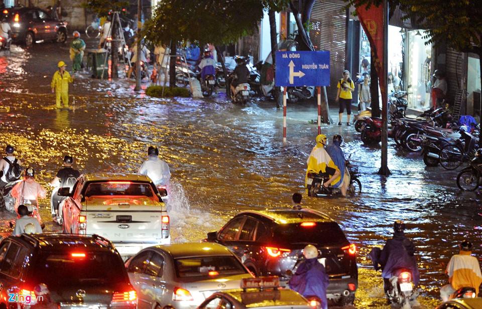 Nhiều tuyến phố chìm trong biển nước, gây ách tắc giao thông. Ảnh: Việt Linh.