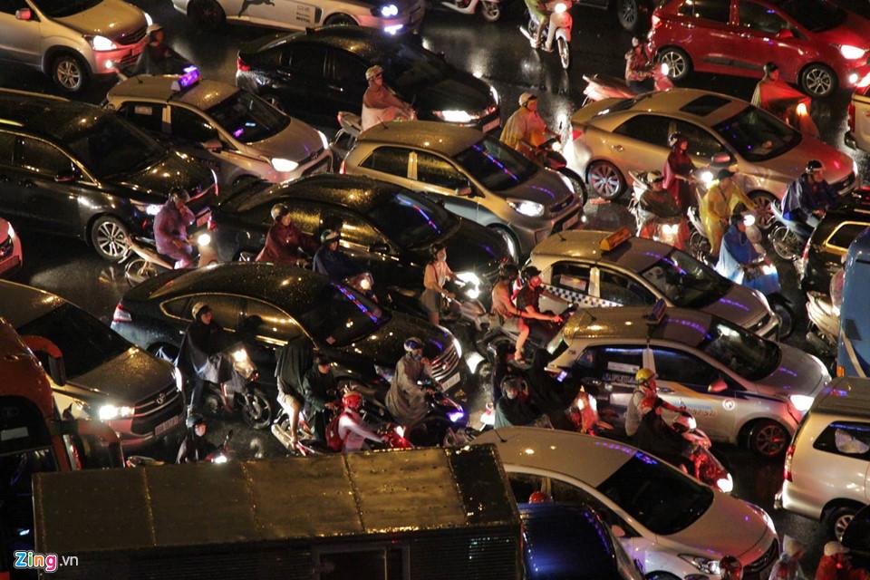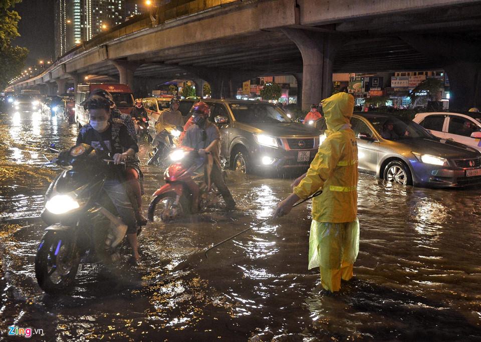 Mưa ngập kéo theo tắc đường ở đường Nguyễn Trãi (quận Thanh Xuân), tuyến đường vành đai 3 trên cao... Ảnh: Việt Linh.