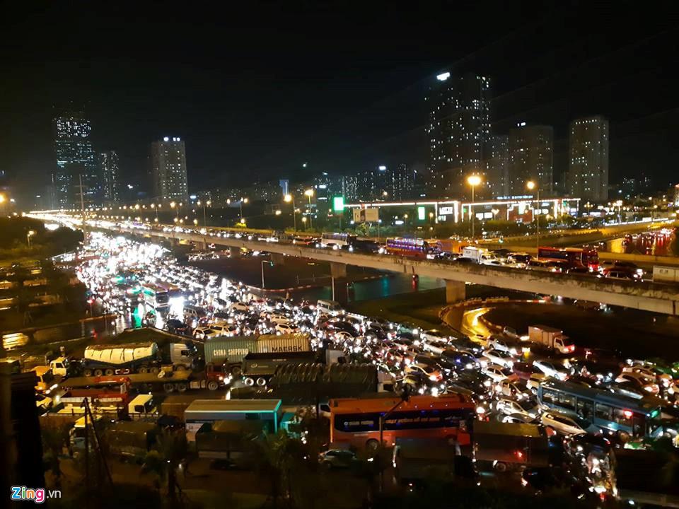 Tình trạng tắc nghẽn giao thông tại ngã tư Đại lộ Thăng Long giao với vành đai 3 bắt đầu từ 19h. Đến 20h30, dòng xe cộ mới bắt đầu di chuyển được. Ảnh: Ngọc Tân.