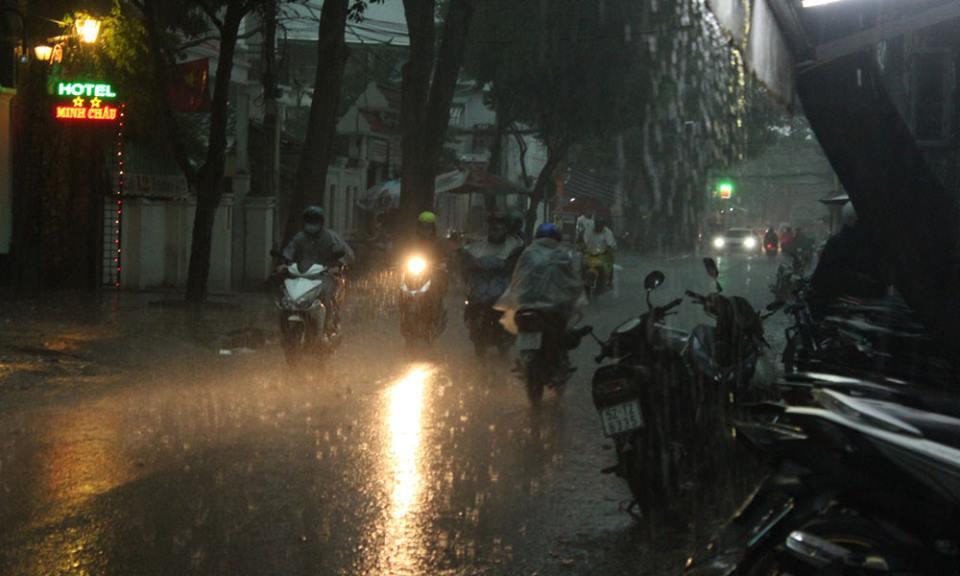 Cơn mưa bất chợt, khiến một số người đi xe máy phải tấp vào lề đường trốn mưa.