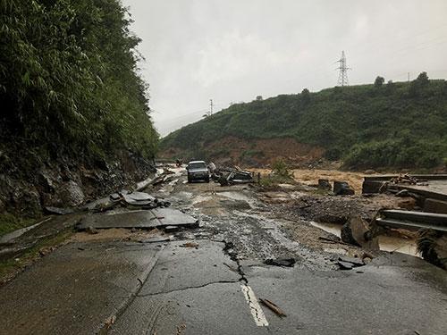 Mưa lũ cuốn trôi mặt đường quốc lộ 4D, đoạn qua Thủy điện Chu Va. (Ảnh: báo Lai Châu)