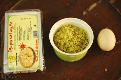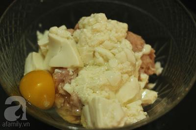 Cho thịt, trứng, đậu phụ, gia vị vào tô, đậu nghiền mịn. Trộn đều hỗn hợp.