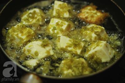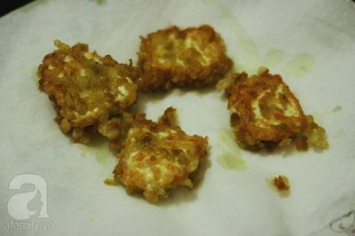 Đun sôi dầu, thả từng miếng đậu phụ tẩm cốm vào chiên vàng.