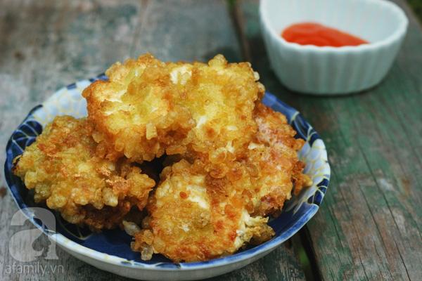 Chỉ cần cắn một miếng đậu phụ tẩm cốm chiên giòn thôi bạn cũng đủ cảm nhận vị ngon ngọt và sự hòa quện hoàn hảo của món ăn. Đậu phụ mềm mịn béo thơm bao bọc bên ngoài lớp cốm giòn giòn ngòn ngọt, ăn no mà cũng không chán.