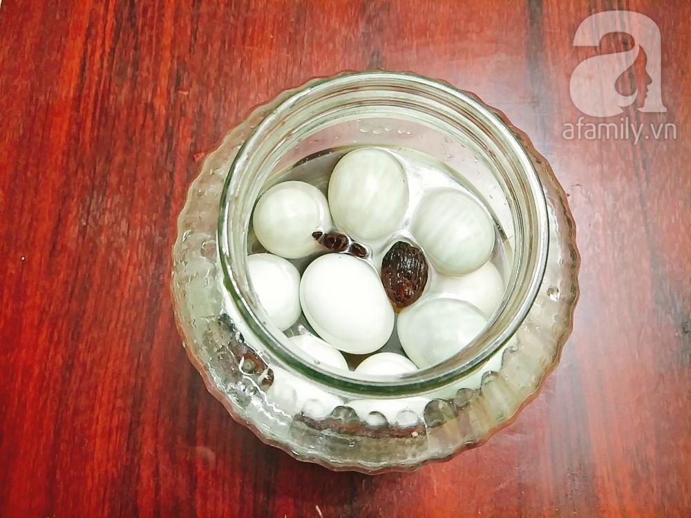 Xếp trứng vịt vào hũ sau đó đổ nước muối đã nguội vào, dùng vỉ tre hoặc 1 cái đĩa nhỏ đè lên cho trứng luôn ngập trong nước muối. Đậy nắp và muối khoảng 25 ngày là trứng chín.