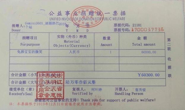 Fan Trung Quốc quyên 60.300 NDT (hơn 200 triệu đồng) dưới danh nghĩa tên người đẹp để làm phẫu thuật cho các trẻ em bị hở hàm ếch
