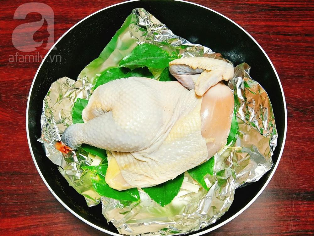 Gà chín lấy ra chặt miếng vừa ăn và chấm với muối tiêu ớt rất ngon miệng.