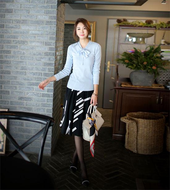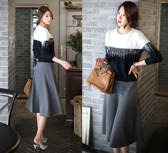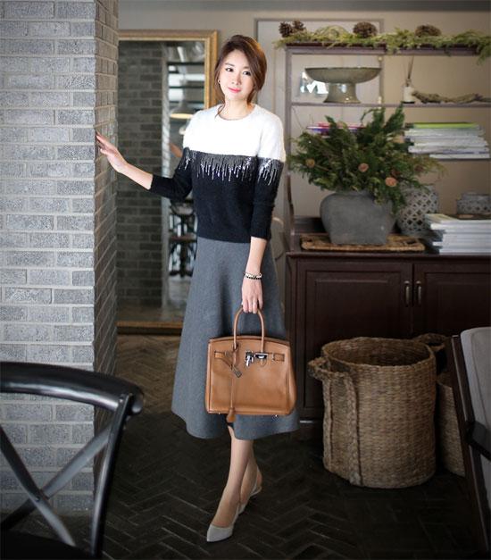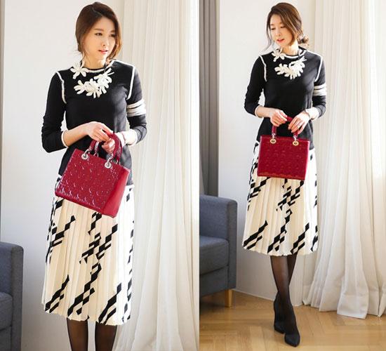 Áo len có điểm xuyết tông màu cùng tông với họa tiết của chân váy cũng là cách