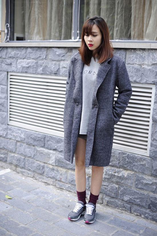 Hoàng Thùy tinh tế kết hợp áo choàng sắc màu, legging, giày thể