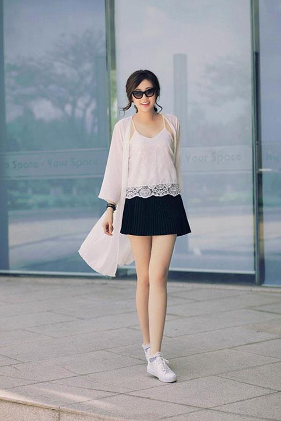 Á hậu Tú Anh trẻ trung khi diện lên mình áo dây, váy xòe, áo choàng nhẹ