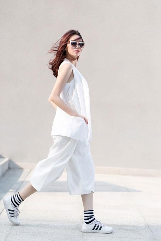xẻ sau kết hợp giày thể thao như Thu Hiền để khoe dáng mảnh dẻ.