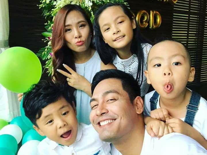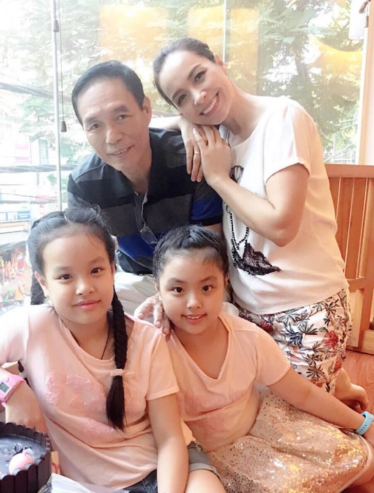 Thúy Hạnh đăng ảnh tựa đầu lên vai cha và chụp hình cùng hai công chúa nhỏ.