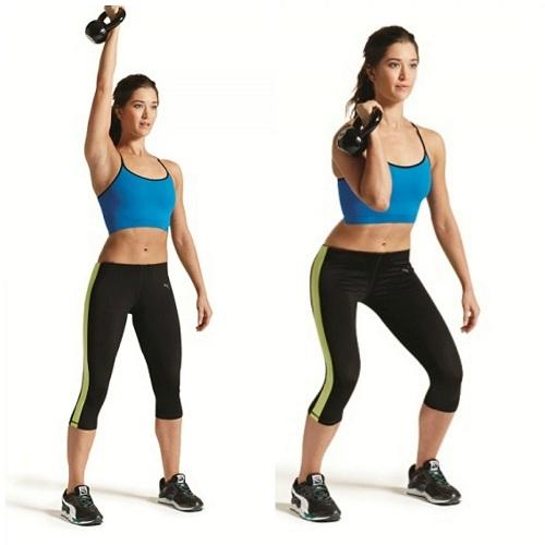 - Hạ thấp trọng tâm đồng thời đưa tạ xuống ngang vai, giữ vài giây rồi trở về tư thế ban đầu. Lặp lại khoảng 10 lần sau đó đổi bên và thực hiện tương tự. Đây là bài tập gym tăng cân dễ thực hiện và đạt được hiệu quả nhanh chóng nếu các bạn nữ kiên trì luyện tập đều đặn mỗi ngày.