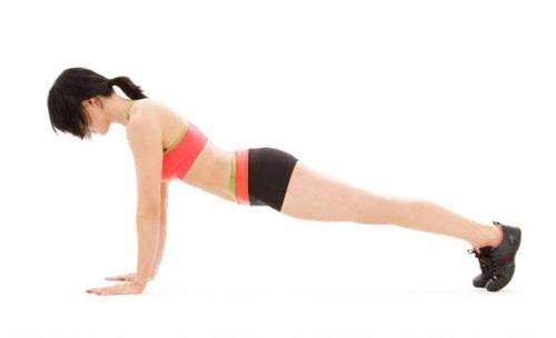 - Tư thế chống đẩy: đầu mũi chân và hai tay cầm tạ tiếp đất.