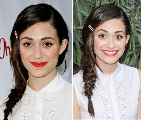 Emmy Rossum nhí nhảnh và trẻ trung tóc tết đuôi cá và áo sơ mi trắng.