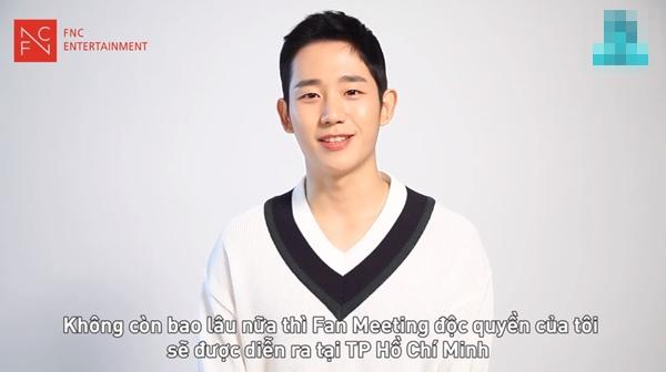 Mở đầu video clip chào người hâm mộ Việt Nam, soái ca “Chị đẹp” đã khiến trái tim fan tan chảy: “Xin chào các bạn, tôi là diễn viên Jung Hae In. Không lâu nữa fan meeting của tôi sẽ được tổ chức tại TP HCM. Đây là cơ hội để tôi và các bạn có thể tạo thêm nhiều kỉ niệm với nhau nên tôi rất háo hức”.