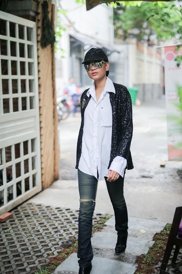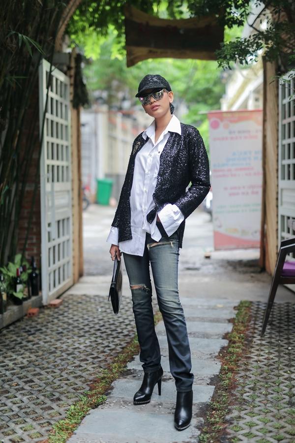 Tới dự buổi casting, Á hậu Trương Thị May gây ấn tượng mạnh bởi bộ trang phục và kiểu tóc vô cùng cá tính. Khác hẳn với hình ảnh nữ tính, dịu dàng thường thấy khi xuất hiện tại các sự kiện với tà áo dài nền nã hay chiếc đầm bồng bềnh, duyên dáng, Trương Thị May bỗng "lột xác" hoàn toàn với quần jean rách, áo sơ mi kết hợp với áo khoác ngoài màu bạc, kính tráng gương vô cùng nổi bật và kiểu cách.