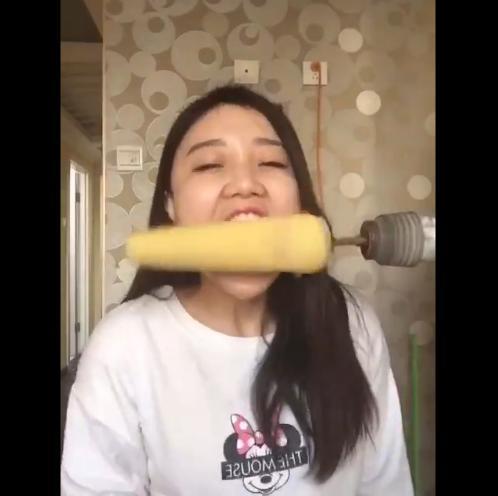 Có thể nói hiếm có cô gái trẻ nào lại có thần kinh thép như nữ nhân vật này. Không những mạo hiểm thực hiện thử thách ăn ngô bằng máy khoan mà sau khi xảy ra sự cố, cô gái người Trung Quốc vẫn bình tĩnh kiểm tra lại hiện trạng mái tóc của mình. Khi đến khám ở bệnh viện, trạng thái tâm lý của cô cũng rất ổn định!