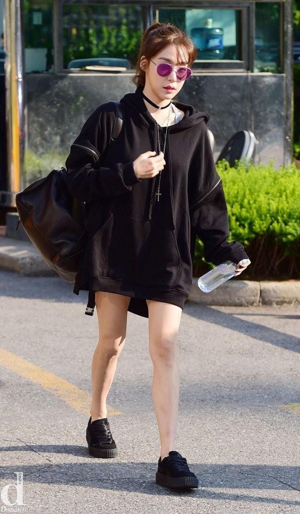 Hyoyeon của nhóm SNSD kết hợp xu hướng giấu quần cùng kiểu áo trễ cổ. Tuy nhiên,