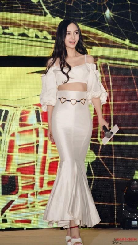 Angelababy tạo nên vẻ sexy bằng cách kết hợp tay bèo chuông với mốt trễ vai, crop top để lộ vòng 2 với chân váy đuôi cá.