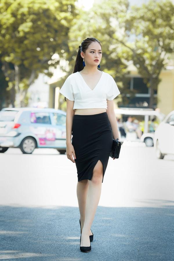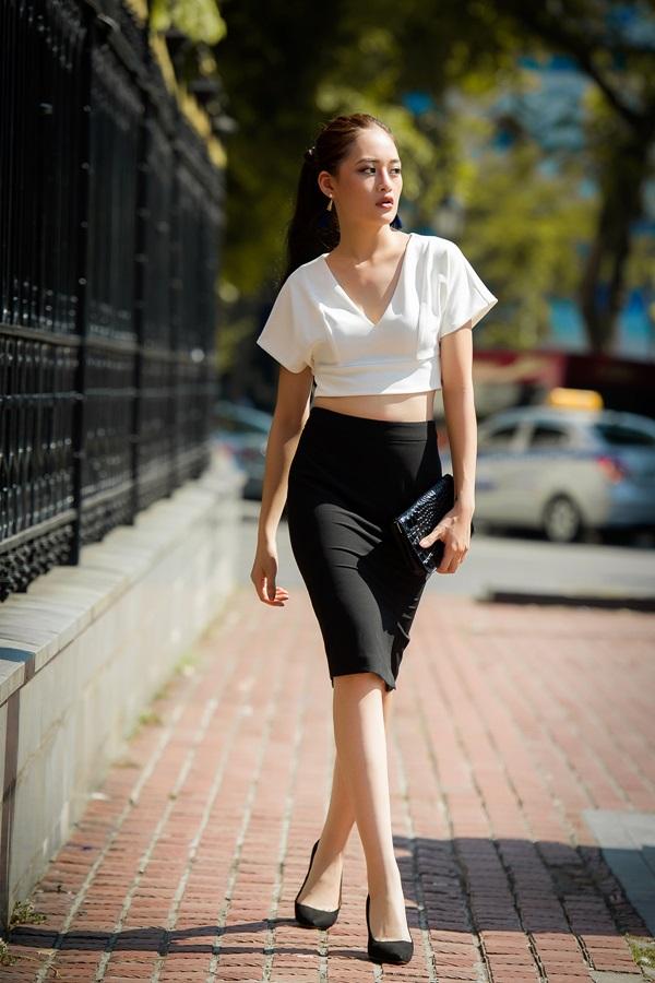 chúng với chân váy xẻ đùi cạp cao, Thùy Anh khoe được vòng eo thon thả.