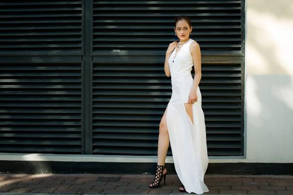 Nữ diễn viên khoe chân trong bộ váy xẻ hai tà cao đến hông. Đây là một trong những