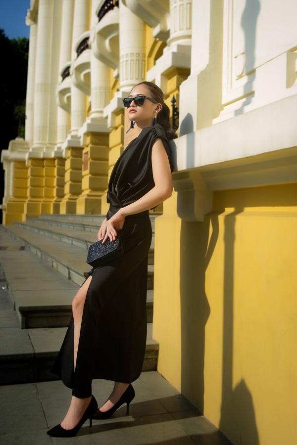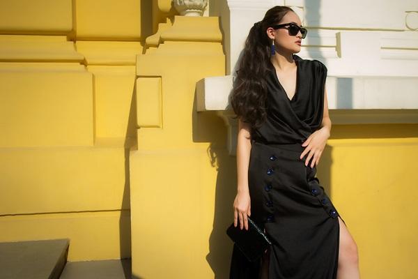 đầm xẻ cổ rộng màu đen. Cách chơi tông màu tinh tế giữa đầm và nội y giúp người đẹp toát