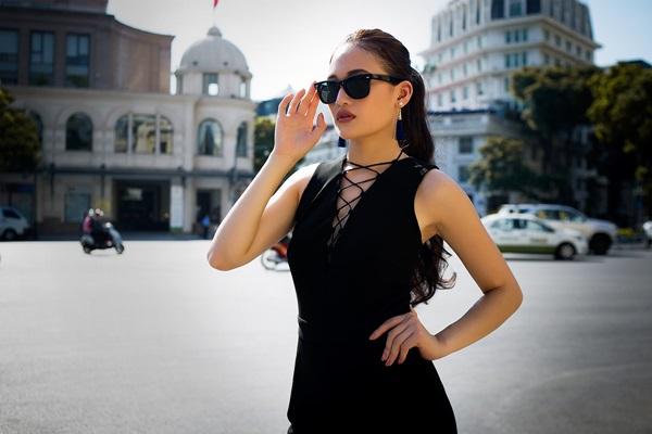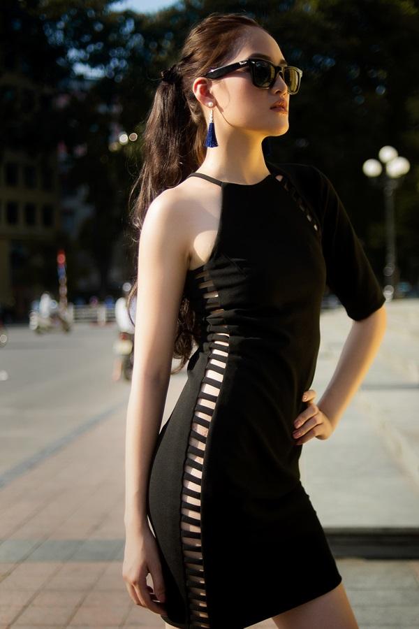 Váy cut-out hở lườn - một trong những vũ khí lợi hại giúp các người đẹp khoe thân - được Thùy Anh kết hợp với kính mắt sành điệu. Phom dáng bó sát tôn lên đường cong của