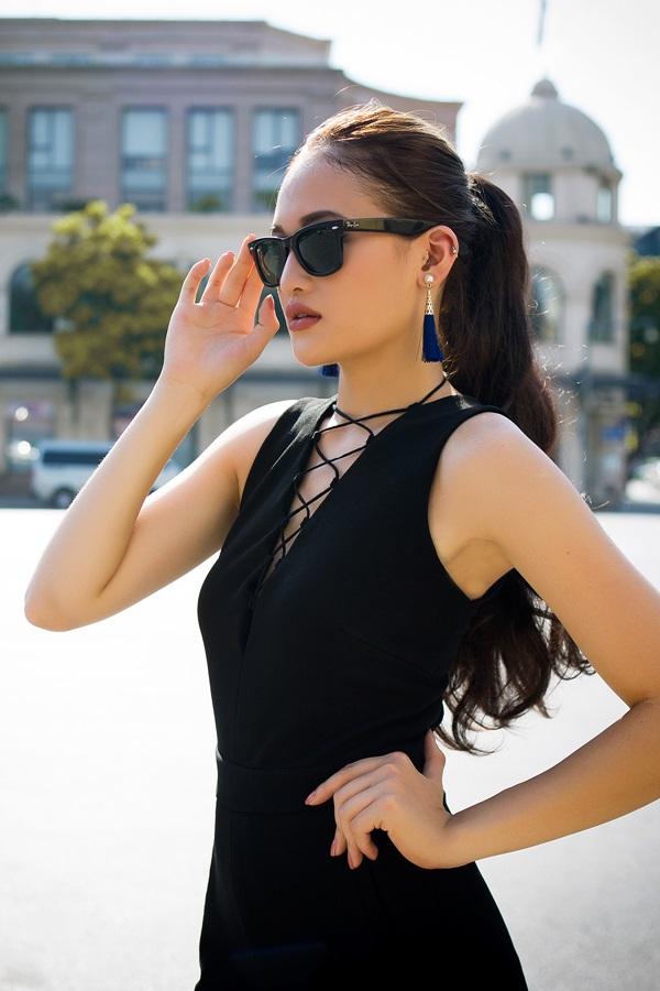 Chi tiết đan dây ở phần cổ chữ V được kết hợp khéo léo với đôi sandals cùng phong cách, giúp tạo nên vẻ ăn ý cho tổng thể. Bên cạnh đó, nhà thiết kế Hà Trương hàng cúc bố trí