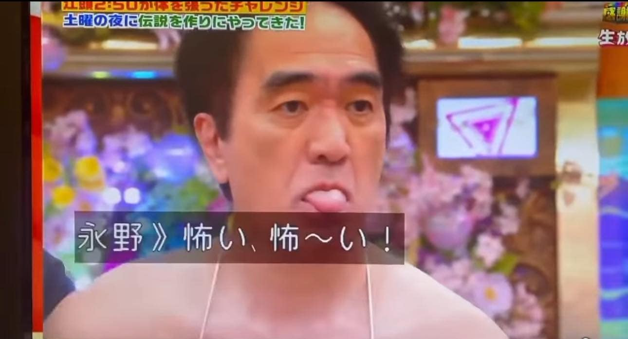 Danh hài không mặc áo, liên tục thè lưỡi hướng về phía nữ diễn viên. Egashira còn có những biểu cảm kinh dị và la hét "Hãy trở thành người phụ nữ của ta", rồi rượt đuổi Nagano Mei chạy lên bục sân khấu.
