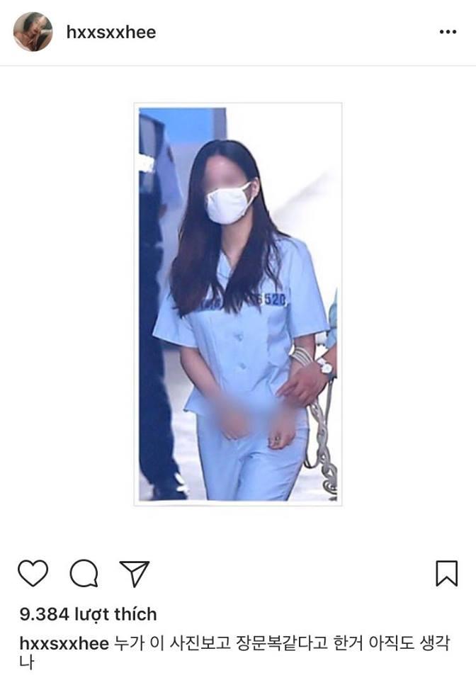 Han Seo Hee đăng tấm ảnh mặc áo tù, bị còng tay lên Instagram với chữ “Kỉ niệm" cùng biểu tượng trái tim. Đây là lúc cô bị tạm giam và đưa đến tòa án để giải quyết vụ việc sử dụng chất kích thích.