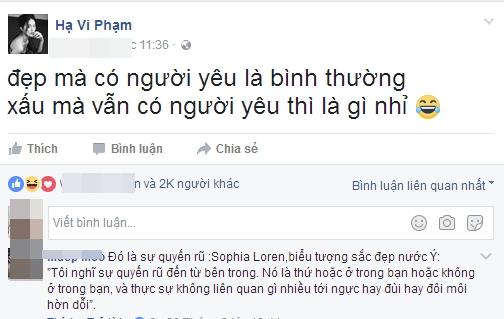 Dòng trạng thái ẩn ý trong thời điểm nhạy cảm của Hạ Vi nhanh chóng thu hút nhiều đáp án. Ngoài ý kiến cho rằng tâm hồn, sự quyến rũ bên trong là quan trọng chứ không phải những thứ hào nhoáng nhan sắc bên ngoài, mỗi người lại tìm cách an ủi "nàng Tấm" theo lý lẽ riêng.