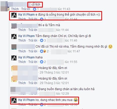 Trong số đó, ý kiến của một Facebooker cho rằng, Hạ Vi là người ngây thơ, đặc biệt trong chuyện tình cảm nên chỉ có thể sống trong thế giới truyện cổ tích đã được cô chú ý đặc biệt. "Em đúng là sống trong thế giới chuyện cổ tích thật mà", Hạ Vi thừa nhận.